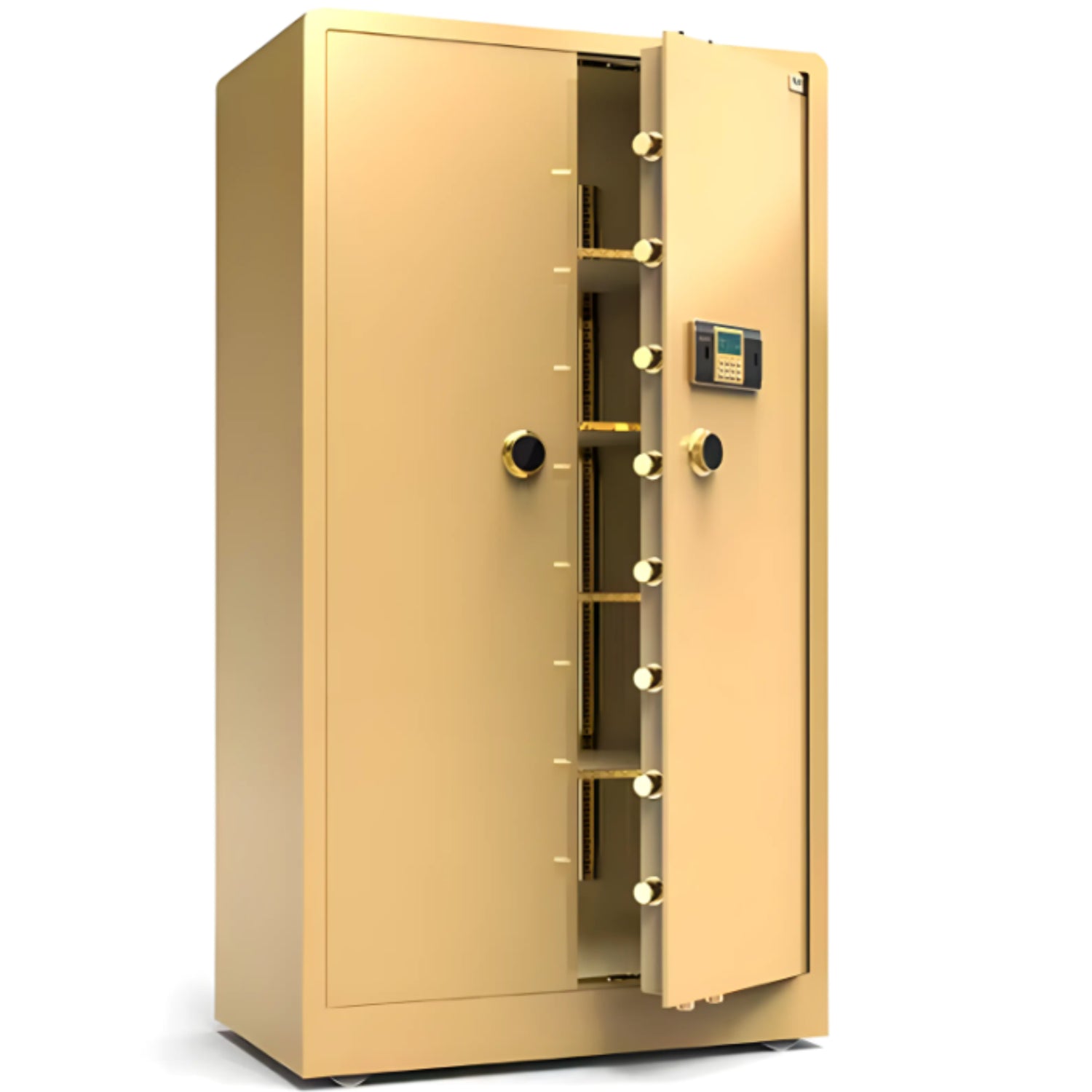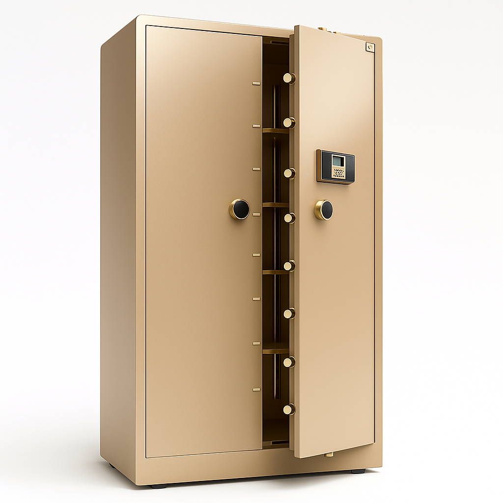 The Sandstone Guardian MaxiVault is a flagship in secure storage, engineered to safeguard bulk assets, legal documents, or high-value items with military precision. Its earth-tone powder coat conceals a dual-layer steel shell reinforced with vertical bolt arrays and a heat-sealed fire barrier. Inside, a modular storage layout supports categorized stacking, ideal for institutional or private use.